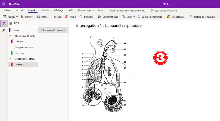 Lors d’un cours en distanciel désynchronisé, il y a possibilité que l’enseignant puisse réaliser et d’enregistrer son cours depuis Microsoft teams (consultez l’article: La gestion des comptes enseignant et élève en classe hybride sur Microsoft 365 – TableauxInteractifs). L’enseignant utilise OneNote comme outil de création de cours, et plus précisément pour la partie travaux pratiques. Comme on peut le voir sur la capture d’écran ci-dessous, l’enseignant a importé une image qu’il a ensuite annoté. Précisons que l’enseignant utilise un écran interactif, en effet, cet outil propose de nombreuses fonctionnalités liées à l’annotation (voir l’article Microsoft 365 pour l’enseignement et la formation avec un écran interactif – TableauxInteractifs). L’annotation se fait depuis l’onglet Dessin, comme on peut le voir, l’écriture est fluide et proche de l’écriture naturelle. Une large palette de couleur est disponible ainsi que le choix de l’épaisseur de la mine. Enfin la gomme est disponible par trait uniquement.